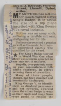 WW1 silver War Badge numbered 172118 together with a newspaper cutting for the recipient Mrs S J Barrah