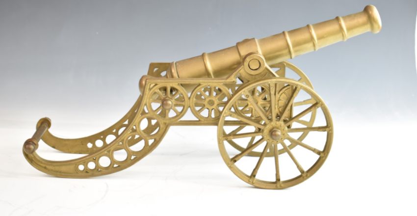 Four model cannon, one with silver plated finish, the others of brass construction, length 44cm