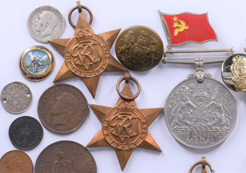 Seven WW2 medals comprising 1939-1945 Star, France and Germany Star, Africa Star, Italy Star, two Defence medals and a War Medal together with commemorative coins / medals etc