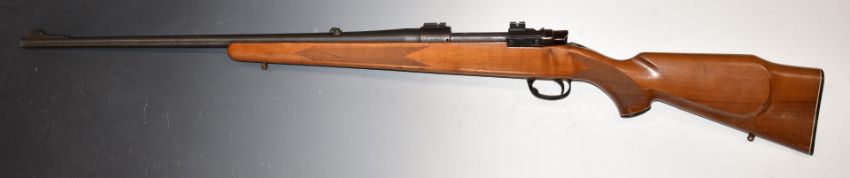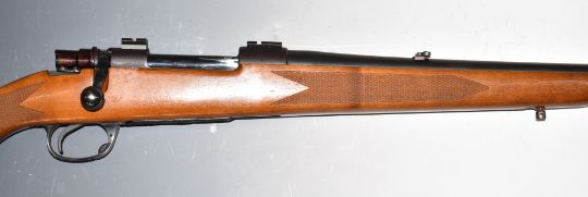 Parker-Hale .243 bolt-action rifle with chequered semi-pistol grip and forend, sling mounts, adjustable pop-up sights, scope mounts and 25 inch barrel, overall length 114cm, serial number 18760.PLEASE NOTE THAT A VALID RELEVANT FIREARMS/SHOTGUN CERTIFICATE IS REQUIRED TO HANDLE/PURCHASE THIS ITEM.