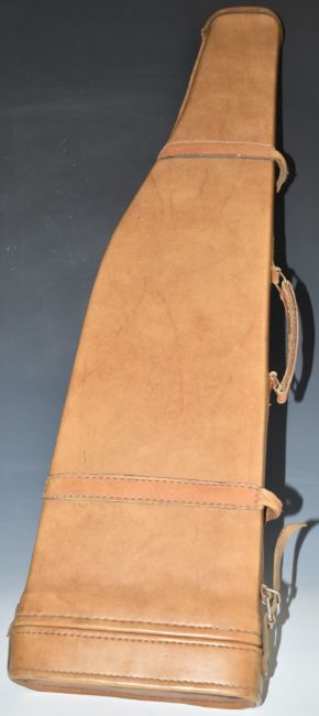 Three leather bound shotgun carry cases including a leg of mutton example, all with fitted interiors.