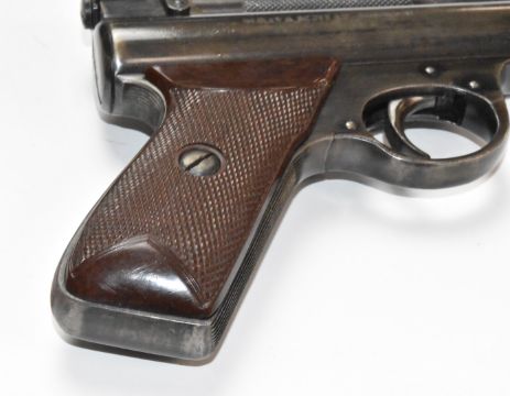 Webley Senior .177 air pistol with chequered Bakelite grips and adjustable sights, serial number 808, in wooden box with spare wooden grips, spring, accessories and instructions.
