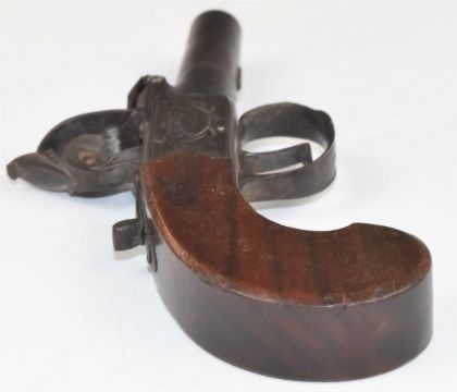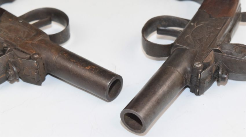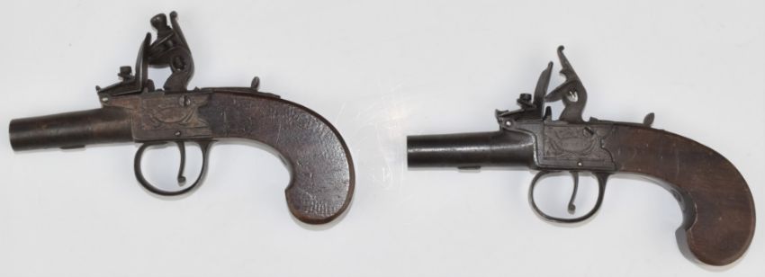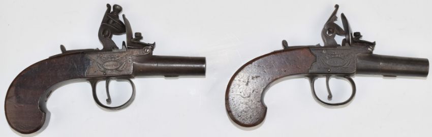 A pair of Dutton of London flintlock pocket pistols each with named and engraved lock, thumb-slide safety, shaped wooden grip and 1.25 inch smooth bored turn off barrel, overall length 14cm.