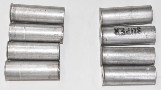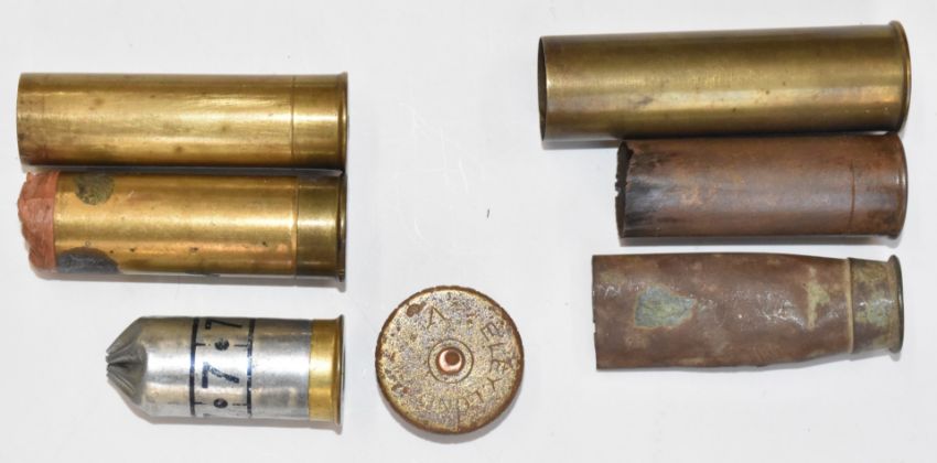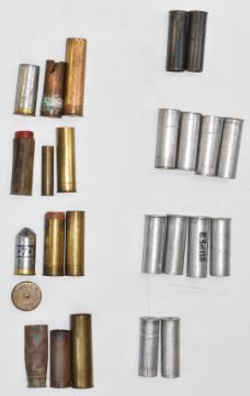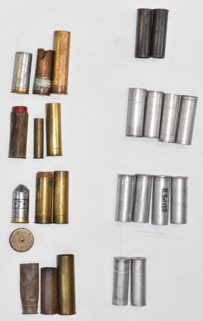 Twenty-four brass and aluminium shotgun cartridge cases including Gevelot 16 bore, French examples, Super etc. From the collection of Ken Rutterford.
