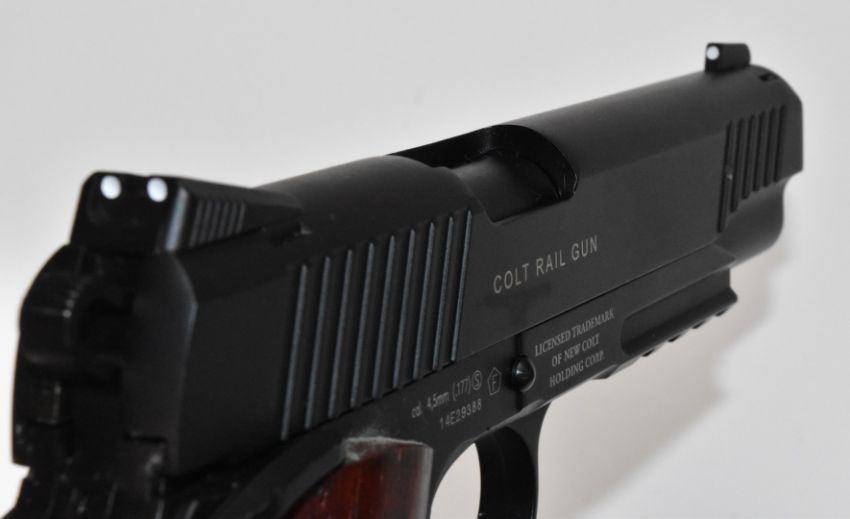 Umarex Colt 45 Government Model Special Combat .177 airsoft pistol with wooden grips, serial number 14E29388, in original box.