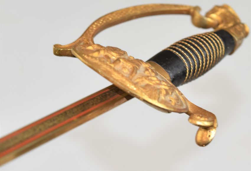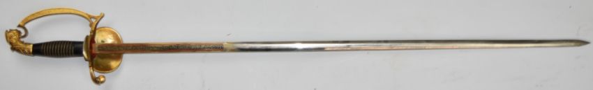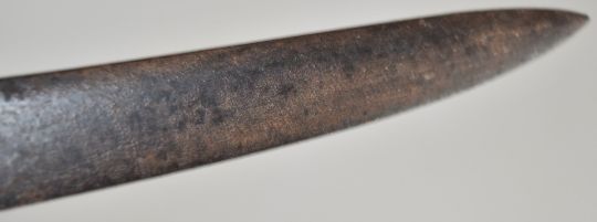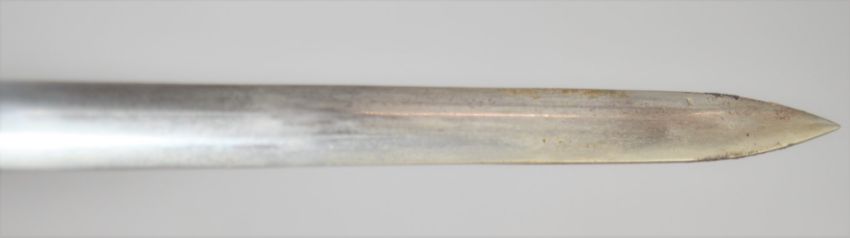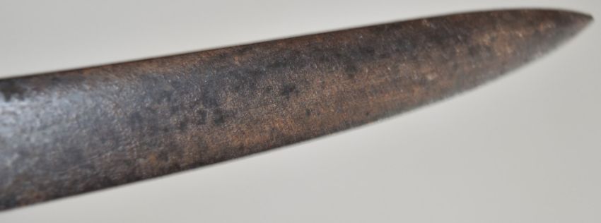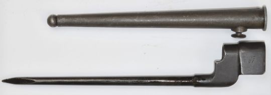 British Mk4 spike bayonet with 20cm blade and scabbard, French chassepot bayonet with 1868 manufacturer date to 57cm fullered yataghan blade, tourist's short sword from India with 54cm blade and a copy continental presentation sword with 75cm blade and sheath. PLEASE NOTE ALL BLADED ITEMS ARE SUBJECT TO OVER 18 CHECK ON COLLECTION OR DELIVERY