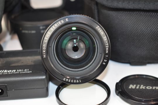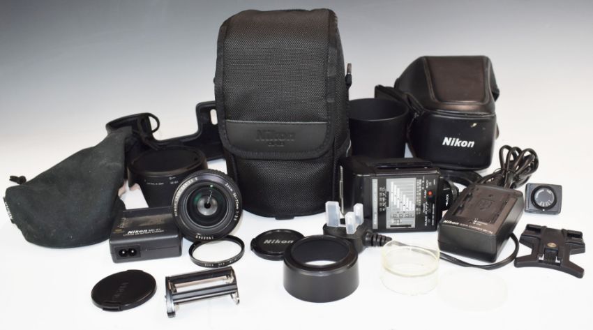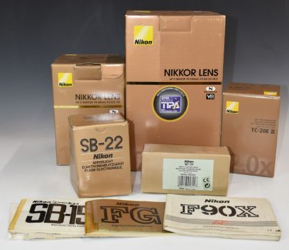 Nikon cameras and accessories to include Nikon F90X SLR camera fitted with Sigma 70-300mm 1:4-5.6 D APO macro lens, Nikon FG SLR camera fitted with Sigma 75-300mm 1:4-5.6 lens, Nikon F-801s SLR camera body in original box, Nikon series E 36-72mm 1:3.5 lens, Nikon boxes and accessories