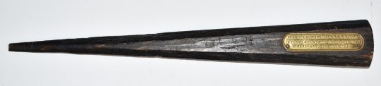 Royal Navy interest wooden letter opener with attached inscription stating 'From the Bowspirit of HMS Victory Nelson's flagship Trafalgar 1805, purchased 2nd June 1937'