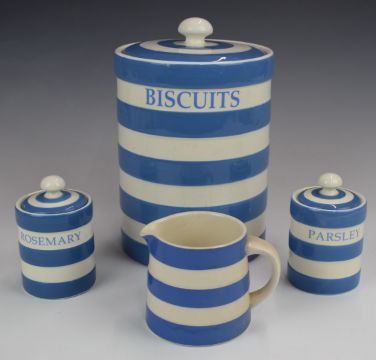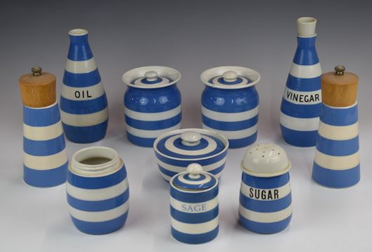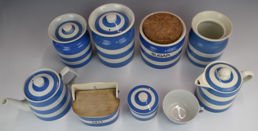 Collection of T G Green and other Cornishware, mostly green stamps, including biscuits, oil and vinegar, other storage jars, salt, cruet etc, tallest 25cm