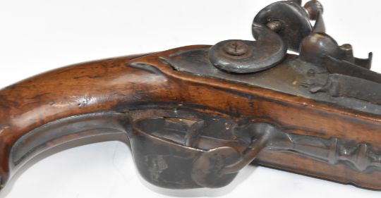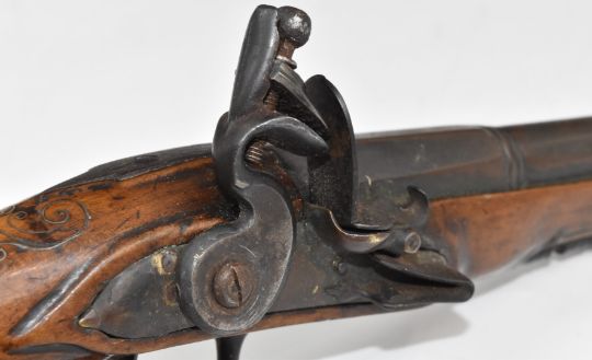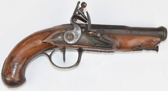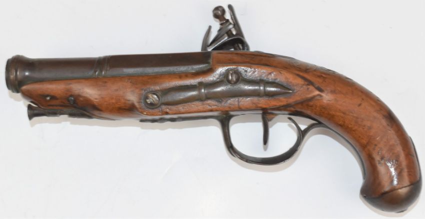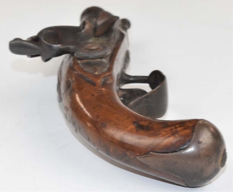 Unnamed flintlock coat pistol with silver wire inlaid grip, metal ram-rod and mounts and 4.25 inch part-octagonal cannon barrel, overall length 23.5cm.