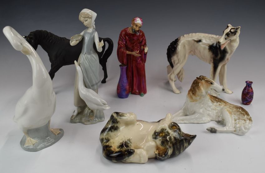 Collection of Lladro, Nao, Beswick, Lomonosov, Winstanley figures etc, tallest 25cm