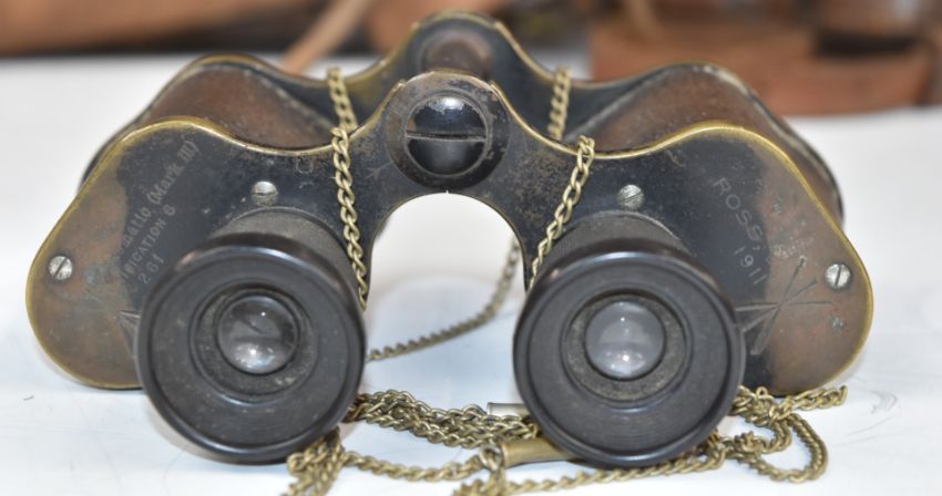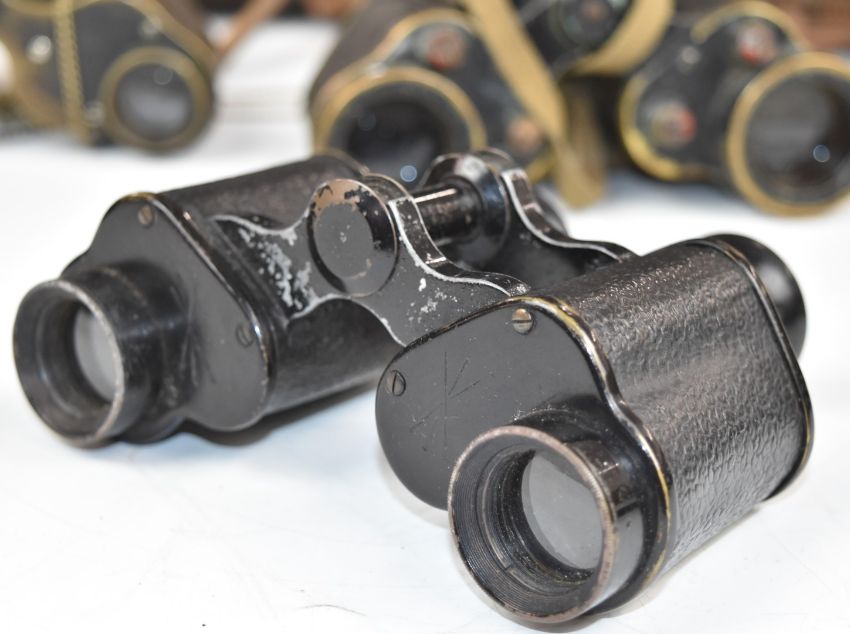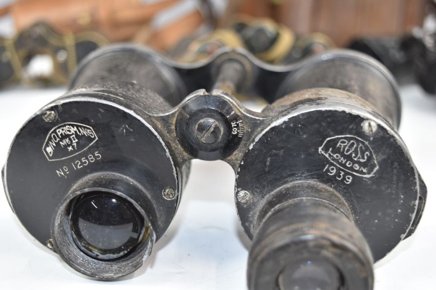 Six pairs of vintage military binoculars to include Hunsicker & Alexis, Taylor-Hobson, 1943 dated Kershaw, 1939 dated Ross of London, 1917 dated Aitchison, 1911 dated Ross, some in original matching leather cases