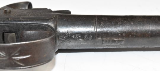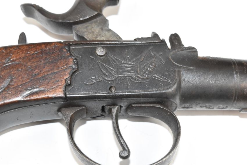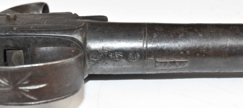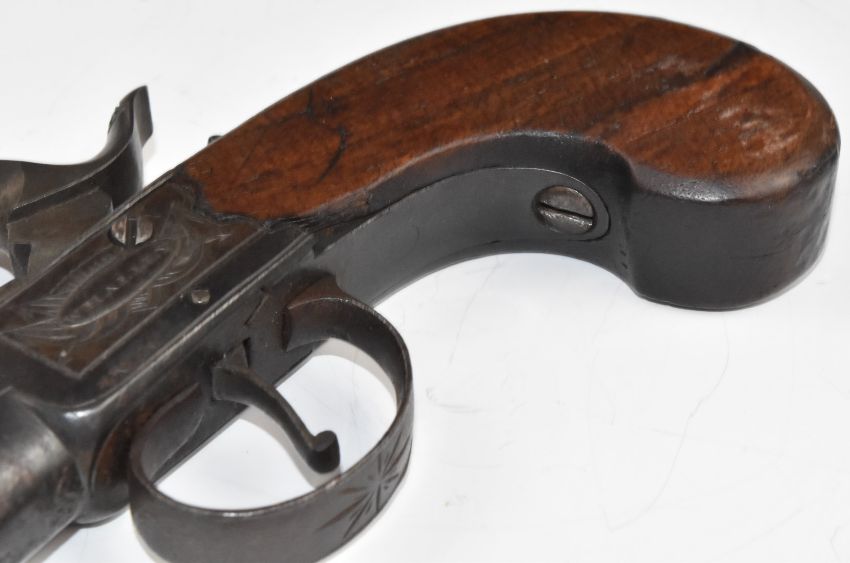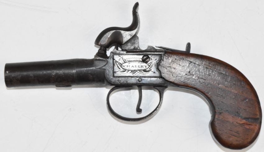 Whalley of Macclesfield percussion converted from flintlock hammer action pocket pistol with named and engraved lock, thumb slide safety and 2.25 inch smooth bored barrel, overall length 16cm.