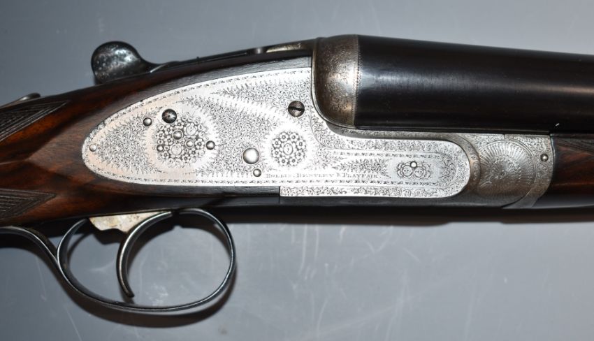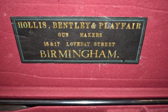 A pair of Hollis Bentley & Playfair 12 bore side by side sidelock ejector shotguns, each with all over fine scrolling and floral engraving, chequered grip and forend, vacant silver cartouche to the underside of the stock, gold inlaid numbering, single trigger and 28 inch barrels choked ½ and improved cylinder, overall lengths 116cm, length of pull 38cm, serial numbers 93015 and 93016, in fitted brass and leather bound double gun case with oil bottle, snapcaps, cleaning rod and 'Hollis, Bentley & Playfair Gun Makers 16&17 Loveday Street Birmingham' label.  PLEASE NOTE THAT A VALID RELEVANT FIREARMS/SHOTGUN CERTIFICATE IS REQUIRED TO HANDLE/PURCHASE THIS ITEM.