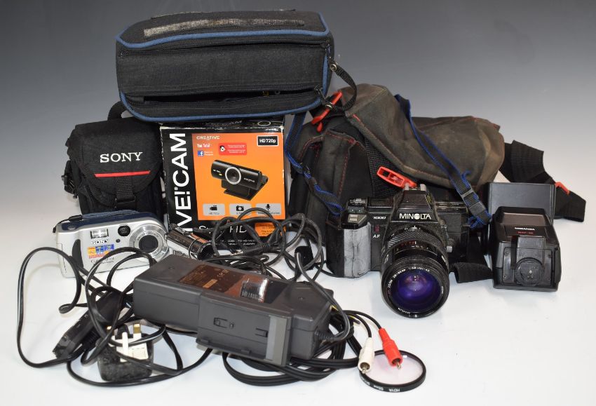 Cameras to include Minolta 7000 SLR with 28-85 1:3.5-4.5 and 80-200mm 1:4.5-5.6 lenses, Traveler HD 10XI and Sony DCR - TRV9E Handycam digital video camera