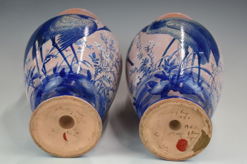 Enoch Wood pair of twin handled pedestal vases decorated with herons, H31cm