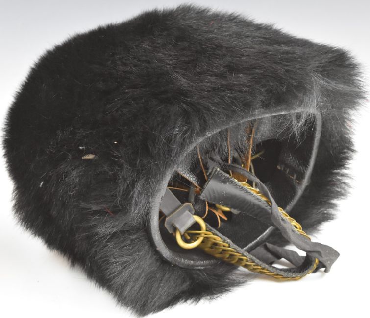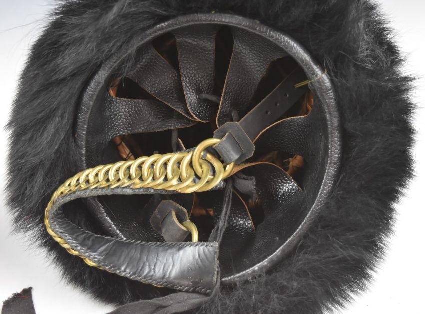British Army Guards Division bearskin hat with wicker cane work interior and leather backed chin strap
