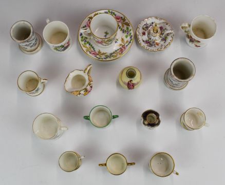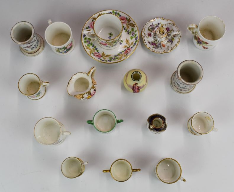 Collection of miniature porcelain including Royal Worcester, Royal Doulton, Crown Derby, Dresden chamberstick, Wedgwood etc, tallest 5.5cm