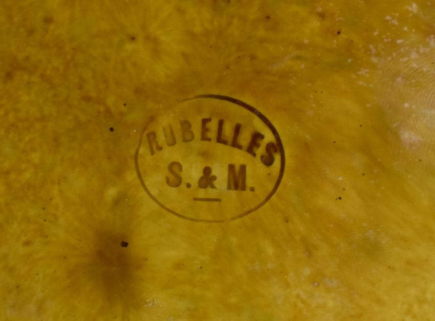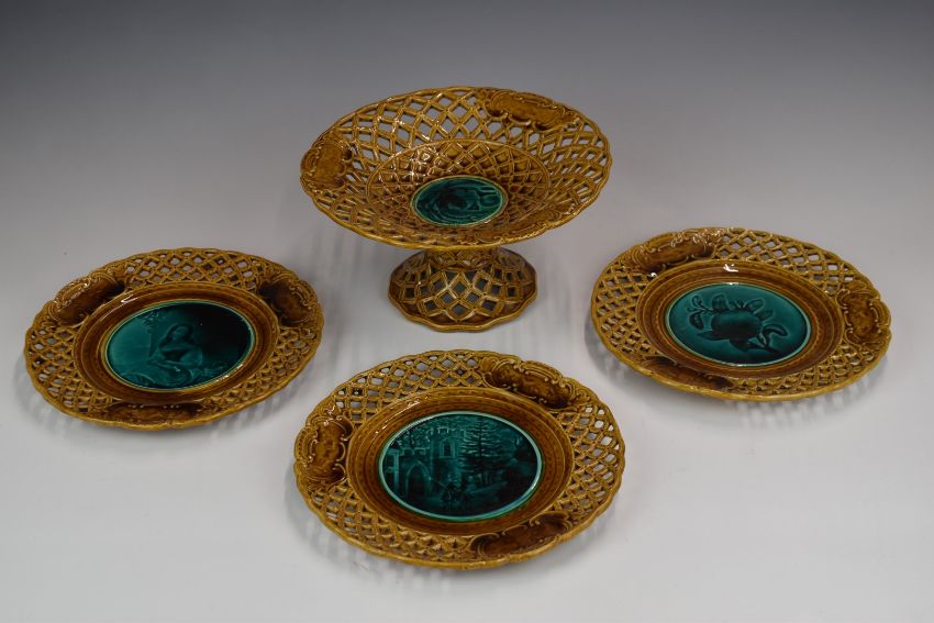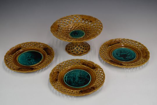 Rubelles S & M 19thC reticulated majolica tazza and three plates, H14 x D23.5cm