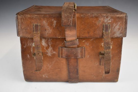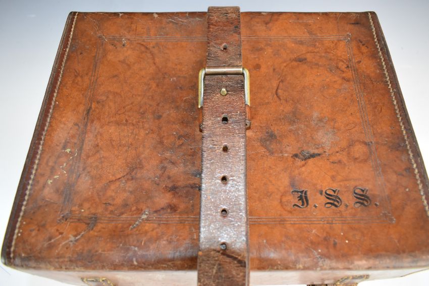 Vintage leather fishing tackle case embossed 'Army & Navy Stores', W31 x D24 x H21cm