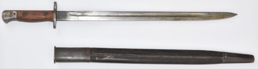 British WW1 1907 pattern bayonet stamped D P 8302 and SLA242, with 42cm single edged fullered blade and leather scabbard. PLEASE NOTE ALL BLADED ITEMS ARE SUBJECT TO OVER 18 CHECK ON COLLECTION OR DELIVERY