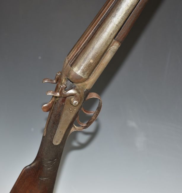 Deactivated E Gale 12 bore side by side hammer action shotgun with vacant cartouche to the underside of the stock, chequered grip and forend and 30 inch barrels, overall length 117cm, serial number 1191, with deactivation certificate dated 13/06/2022.