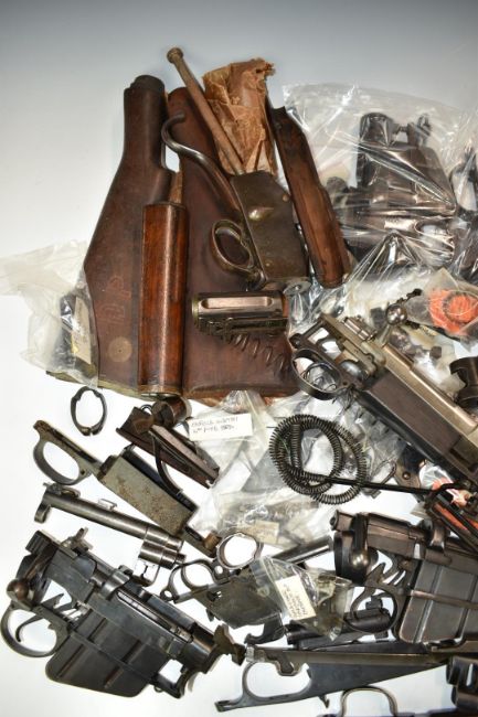 A large collection of rifle parts and accessories including Enfield bolt-action rifle actions, stocks, DWM action, Enfield No.4 rifle stock in original packaging, No.5 Mk.I action etc.  PLEASE NOTE THAT A VALID RELEVANT FIREARMS/SHOTGUN CERTIFICATE IS REQUIRED TO HANDLE/PURCHASE THIS ITEM.