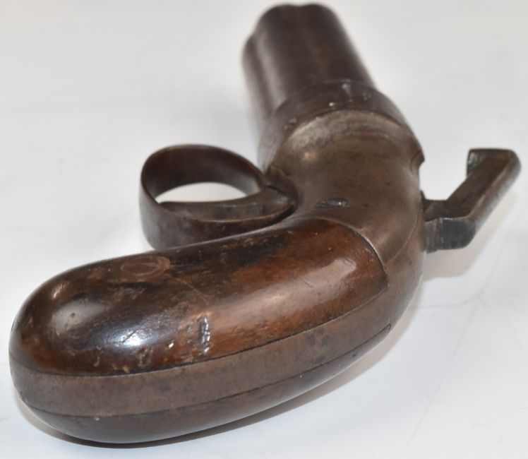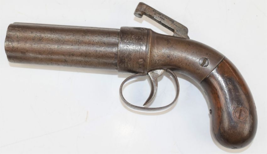 Allen's Patent 1845 six-shot percussion bar hammer action pepperbox revolver with named hammer, engraved frame, shaped wooden grips and 3.5 inch barrels, overall length 20cm.