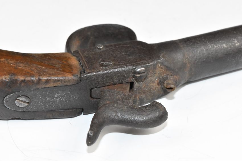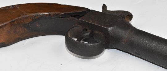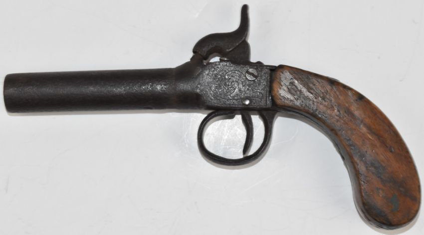 Unnamed percussion hammer action pocket pistol with engraved lock, wooden grip and 3 inch smooth bored barrel, overall length 18.5cm.
