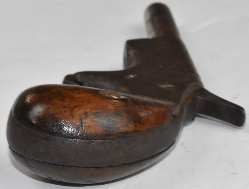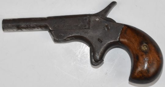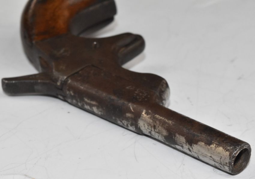 Derringer style hammer action pocket pistol with bulbous wooden grips, sheath trigger and 2.5 inch smooth bored barrel stamped '5.3 07', overall length 11.5cm.