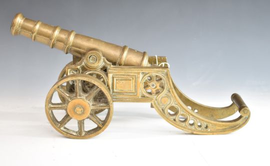 A model desk or signalling cannon with 11 inch graduated brass barrel on brass carriage, overall length 48cm