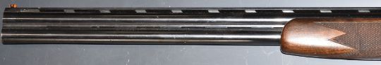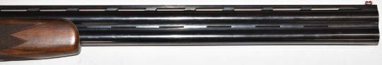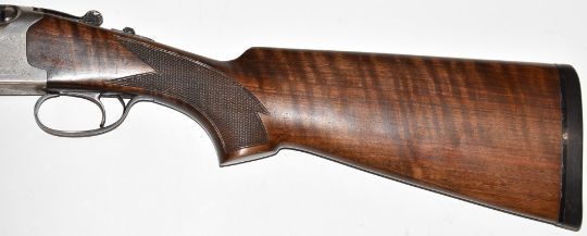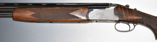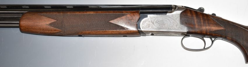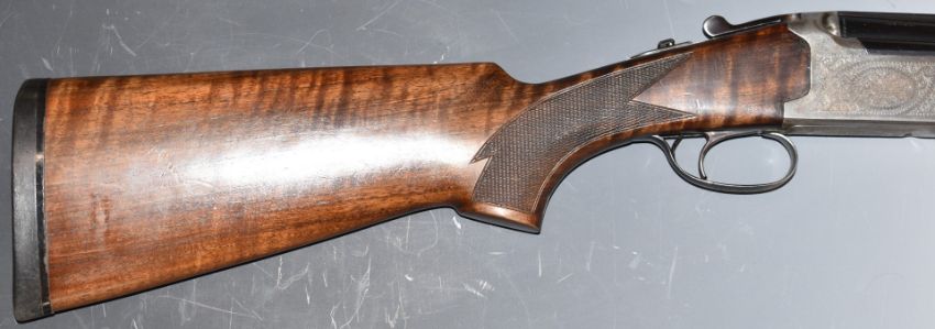 Lanber 12 bore over and under ejector shotgun with floral engraved locks, underside, trigger guard and thumb lever, chequered semi-pistol grip and forend, single trigger, vented top and central ribs and 27.5 inch multi-choke barrels, overall length 113.5cm, length of pull 36.5cm, serial number 270878. PLEASE NOTE THAT A VALID RELEVANT FIREARMS/SHOTGUN CERTIFICATE IS REQUIRED TO HANDLE/PURCHASE THIS ITEM.