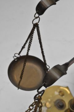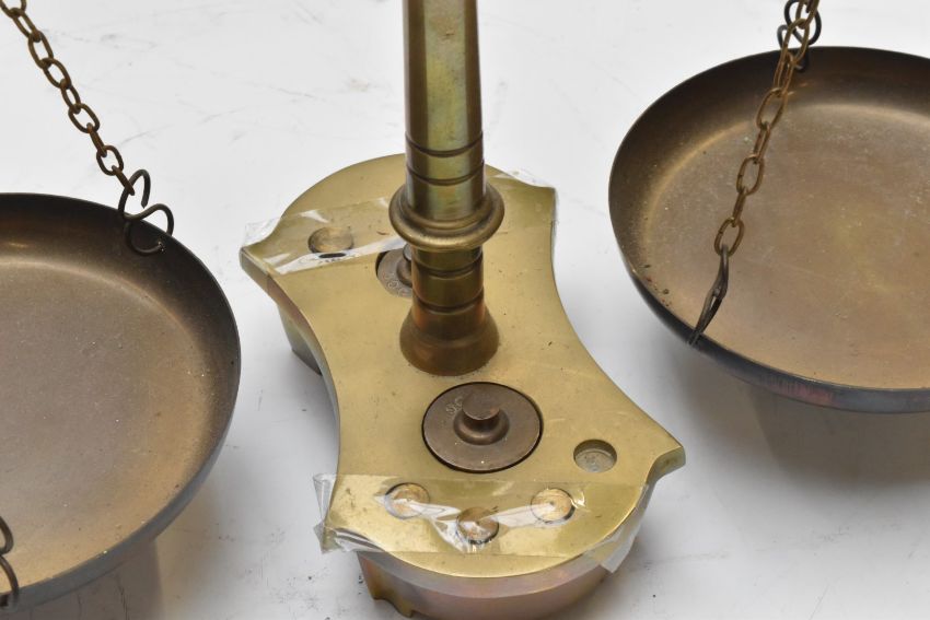 Spanish or similar double set of beam scales on brass base, height 38cm