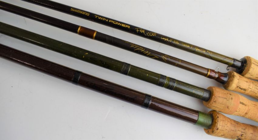 Fly fishing rods including Shimano twin power fly #6-8, Davidstone fly #7-9 and two anonymous rods