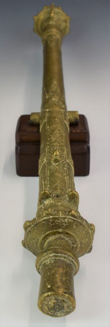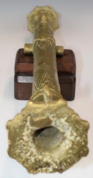 South East Asian bronze lantaka swivel cannon barrel, on wooden stand, length 65cm