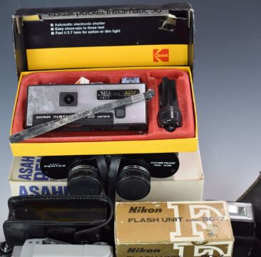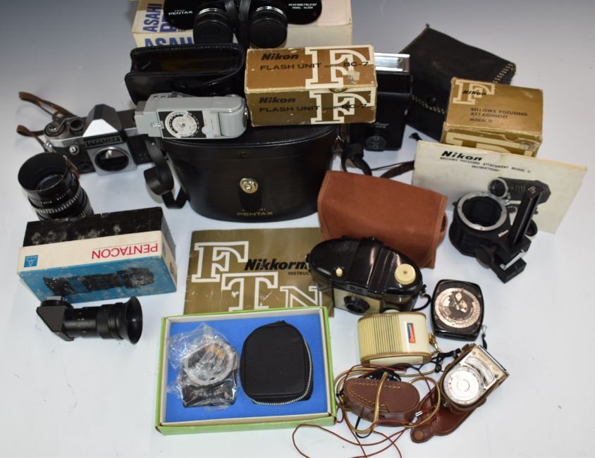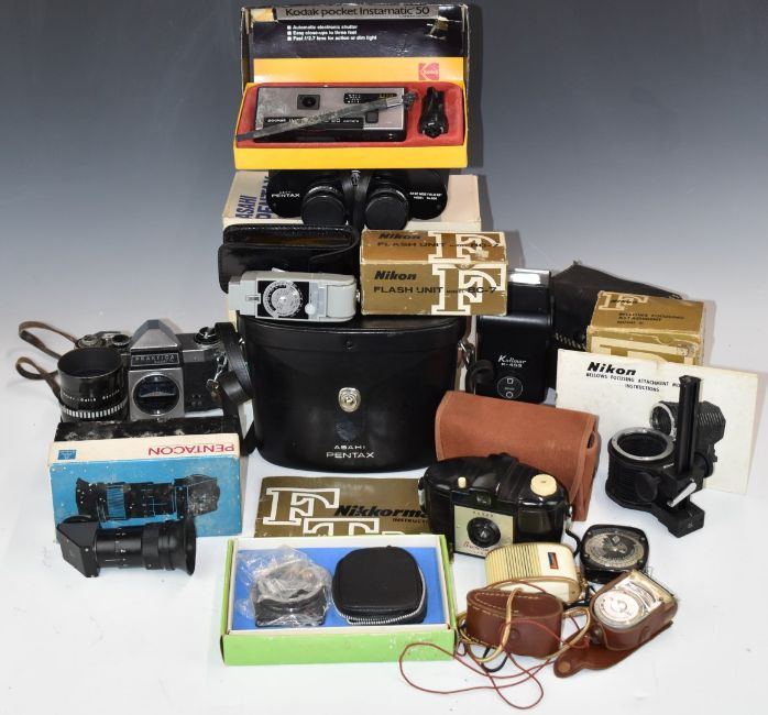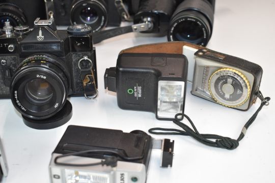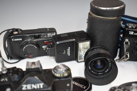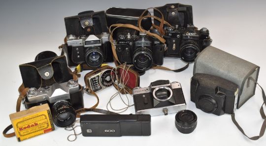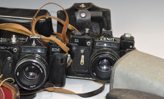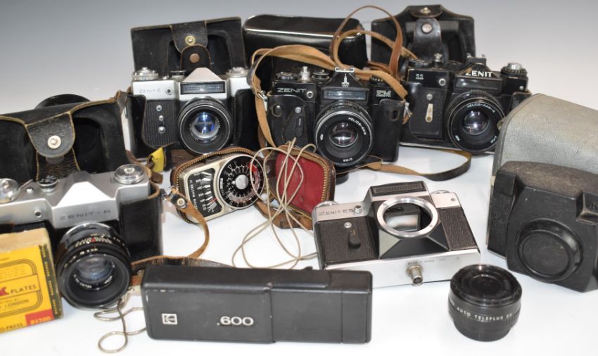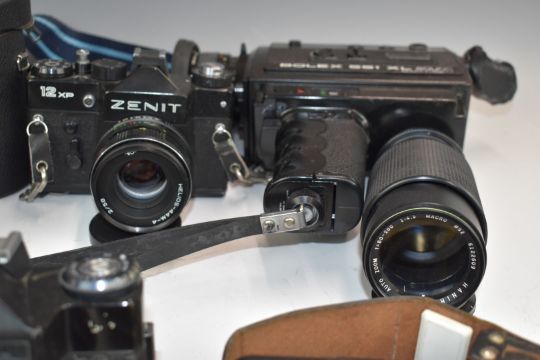 Zenit SLR cameras, lenses and accessories to include 2x EM Olympic edition, 12XP, 2x 11, E, ES and B, most with 2/58 Helios lenses, Bolex 551 cine camera, Hanimex 80-200mm 1:4.5 and 28mm 1:2.8 Hanimex lenses and Photosniper lens in case etc and an HAC short wave receiver kit etc