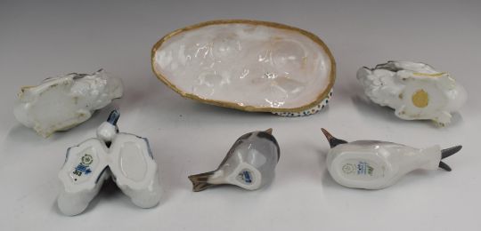 Copenhagen bird figures including ducklings and tern, a pair of continental juvenile swan figures and French Faience Komodo Dragon, tallest 9cm