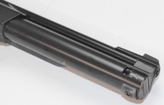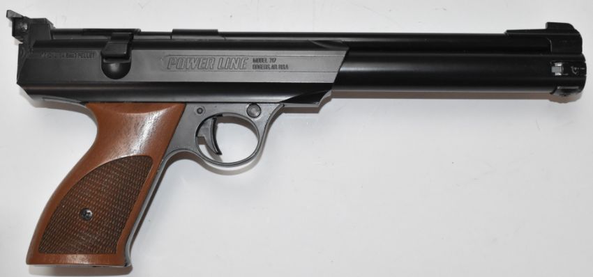 Daisy Power Line Model 717 .177 target air pistol with shaped and chequered grips and adjustable sights, serial number E147536, in original fitted box with related paperwork.