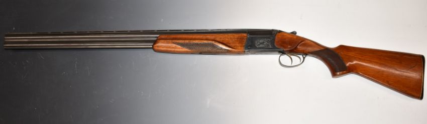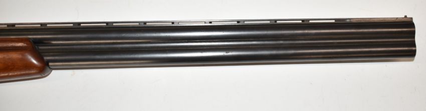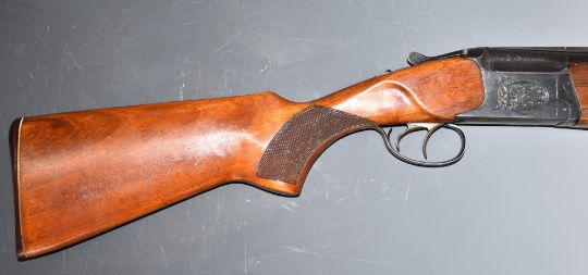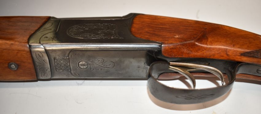 Baikal 12 bore over and under shotgun with engraved scenes of birds to the locks, engraved top lever, trigger guard, top plate, thumb lever and underside, double trigger, chequered semi-pistol grip and forend and 28.5 inch barrels choked ¾ and full, overall length 114.5cm, length of pull 36cm, serial number K17950. PLEASE NOTE THAT A VALID RELEVANT FIREARMS/SHOTGUN CERTIFICATE IS REQUIRED TO HANDLE/PURCHASE THIS ITEM.