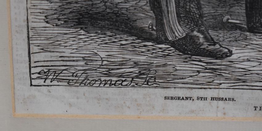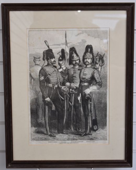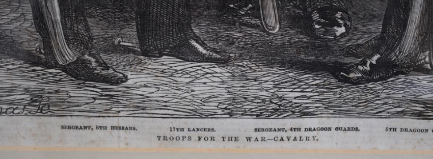 Cavalry etching/picture Troops For The War - 8th Hussars, 17th Lancers, 4th Dragoon Guards, and 5th Dragoon Guards, 39 x 50cm, framed