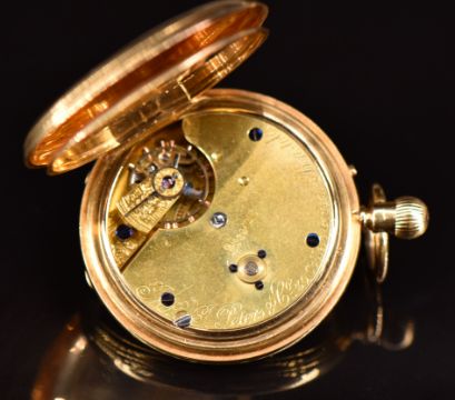 Jonathan J Peters & Co of Bristol 18ct gold keyless winding half hunter pocket watch with inset subsidiary seconds dial, blued hands, black Roman numerals, white enamel dial, inlaid blue enamel Roman numerals to the case and movement signed 'Jno J Peters & Co 30 Collage Green Bristol', case diameter 45mm, serial number 69491, 88.3g.