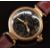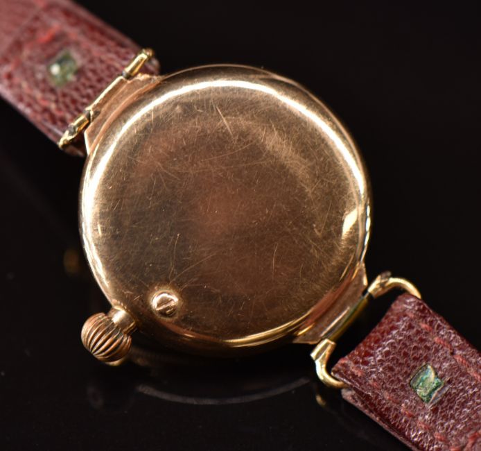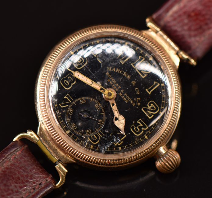 Marcks & Co Ltd of Bombay and Poona 9ct gold gentleman's wristwatch with subsidiary seconds dial, gilt cathedral hands, gold outlined Arabic numerals and black dial, on brown leather strap, case diameter 30mm.