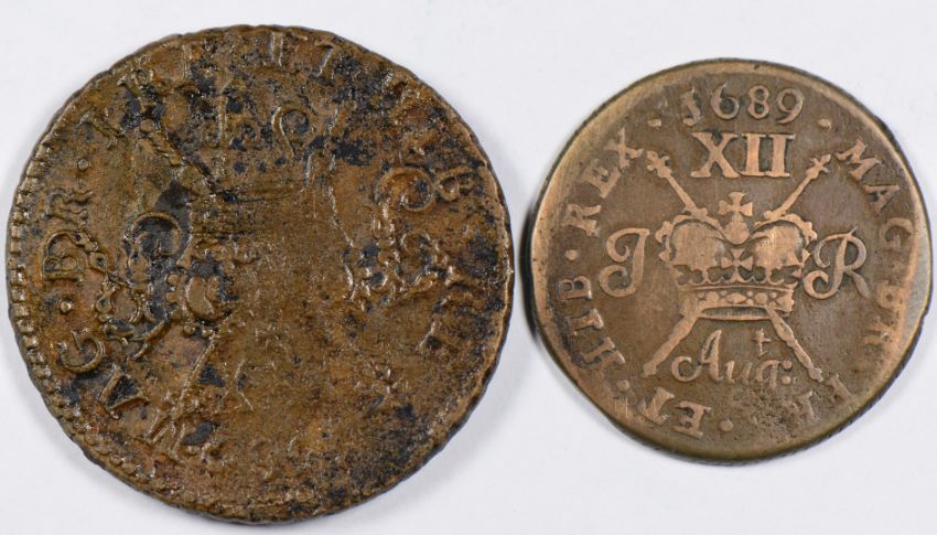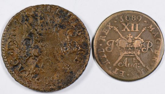 James II 'Gun money' halfcrown, together with a shilling, Aug 1609, and Sept 1689, GF / First