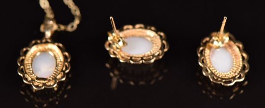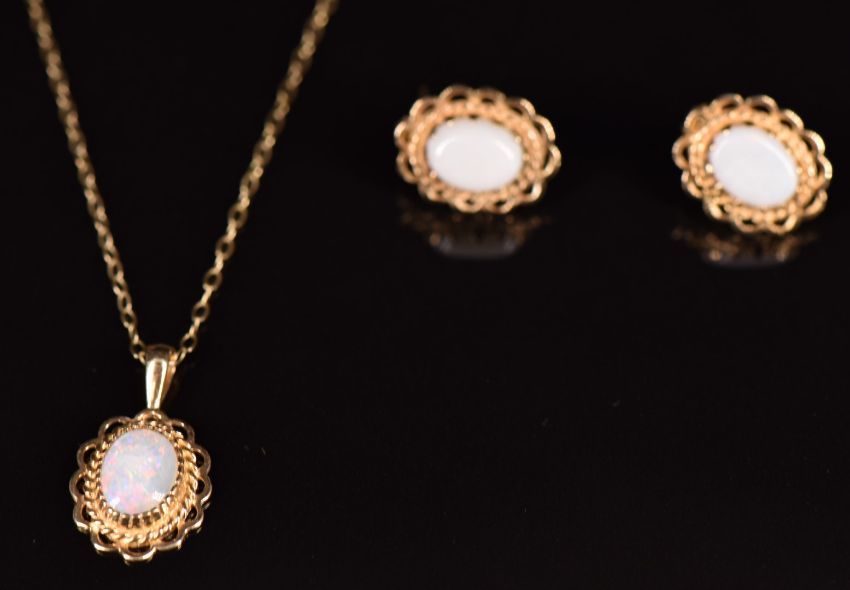 A 9ct gold suite of jewellery comprising earrings and necklace set with opals, 40cm long