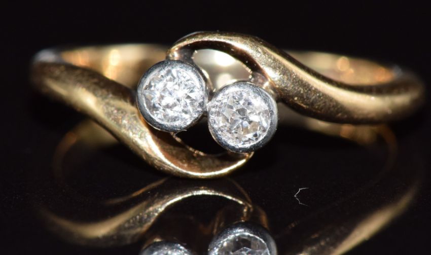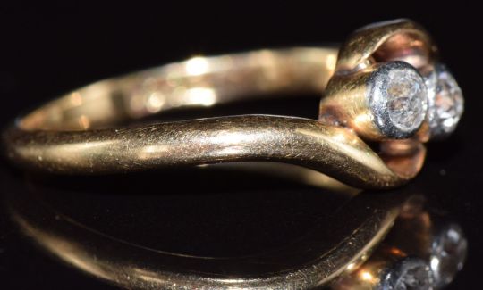 An 18ct gold ring set with two diamonds in a twist setting, 2.2g, size G/H