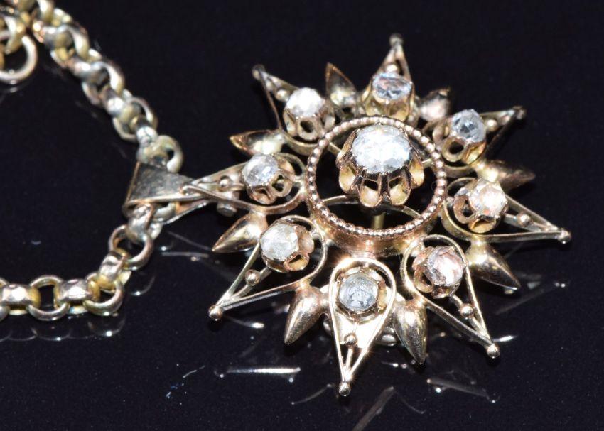 Victorian pendant/ brooch in the form of a star set with rose cut diamonds, on 9ct gold chain, 40cm long, 10.5g