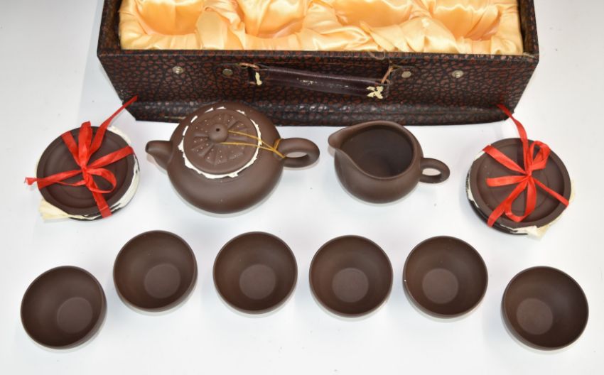 Cased Chinese Yixing tea set with Zun Gui Ming Pin to case, tallest 8.5cm