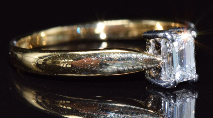 An 18ct gold ring set with an emerald cut diamond of 0.36ct, with original insurance valuation, 3g, size O