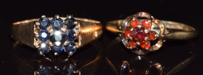 A 9ct gold ring set with garnets and a 9ct gold ring set with sapphires, 3.8g, size Q