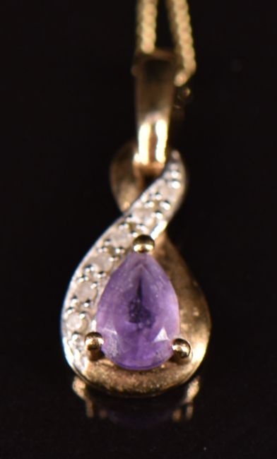 Two 9ct gold necklaces / chains and a 9ct gold pendant set with an amethyst and diamonds, 2.8g, 39cm and 34cm long